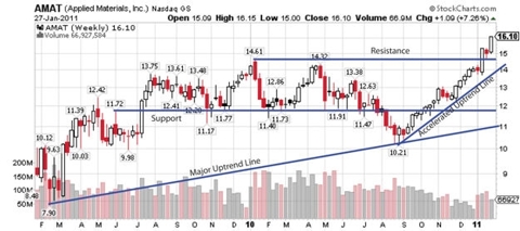 Hitting a low of $10.21 in August 2010, AMAT broke above previous resistance at $12 in October 2010 and has been on an accelerated uptrend (labelled on chart above) ever since.